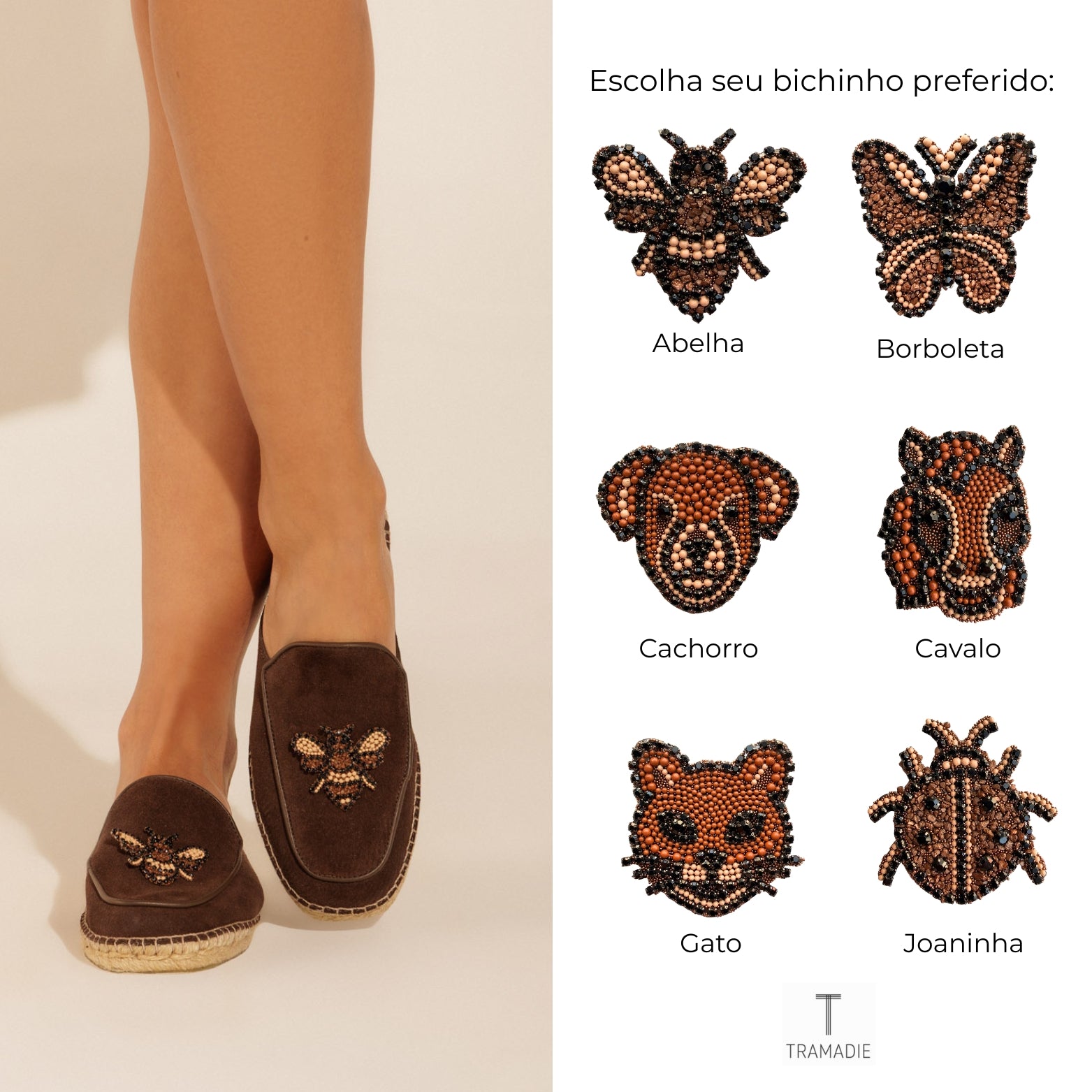 A Mule Régia é uma fusão perfeita entre o toque suave da camurça e o encanto dos bichinhos que amamos. Com design delicado e acabamento artesanal, esta mule traz a personalidade única de seis personagens adoráveis: gato, cachorro, cavalo, abelha, joaninha e borboleta.