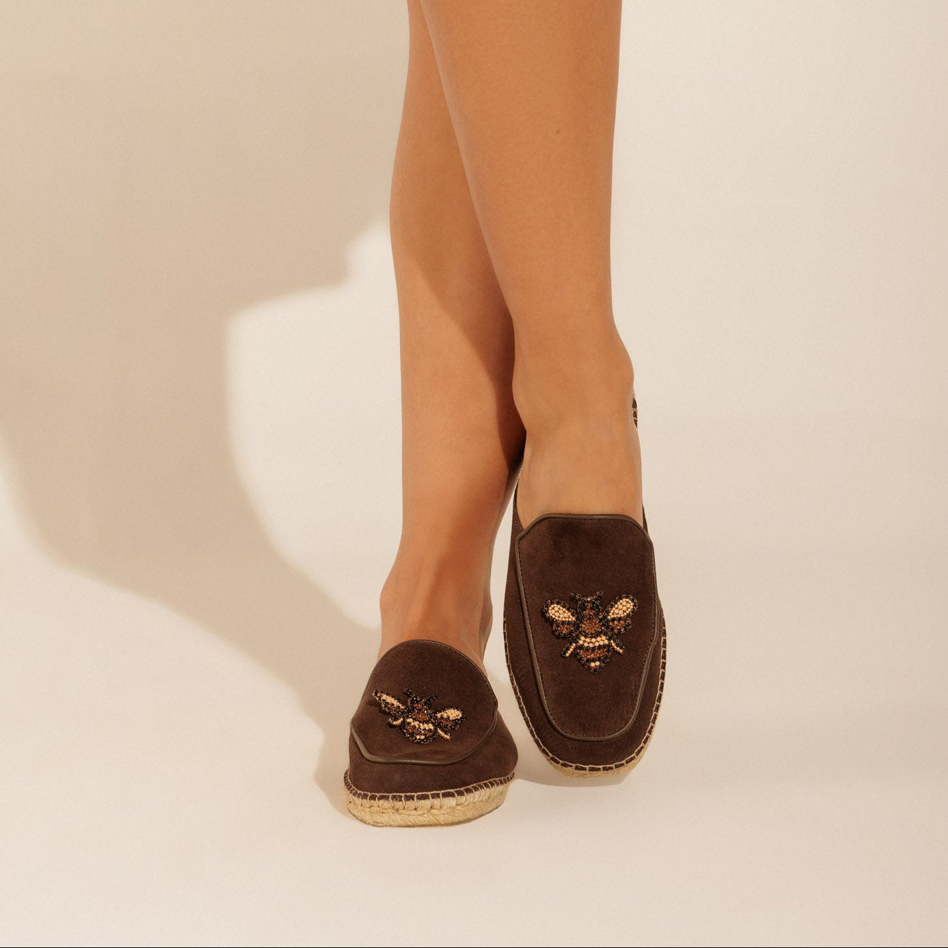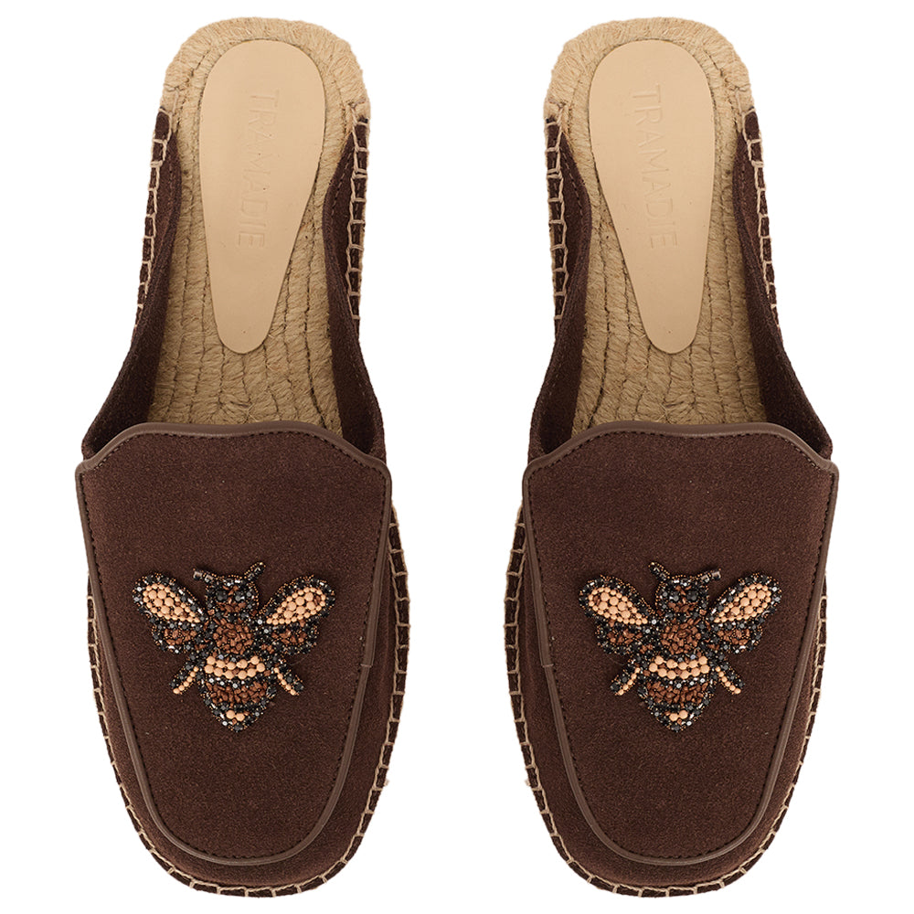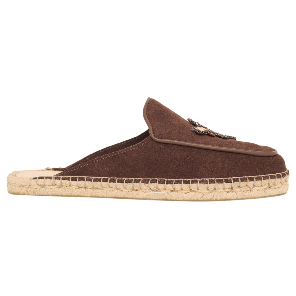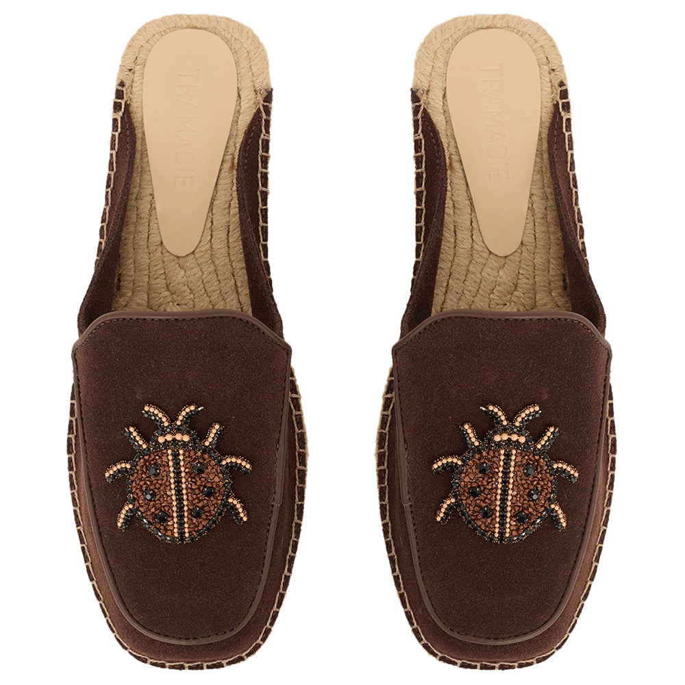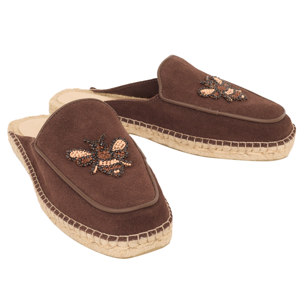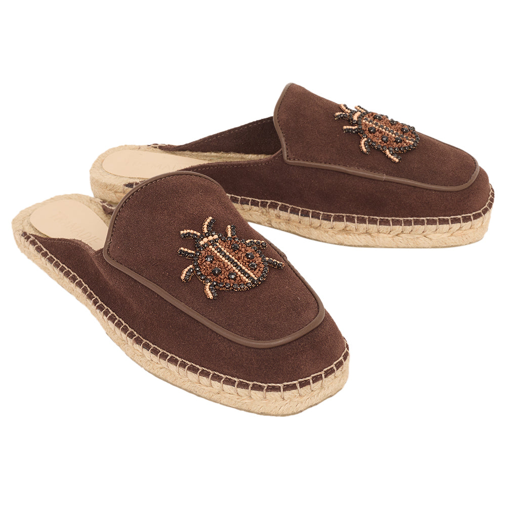 Flat com sola de 1 cm em juta orgânica entrelaçada e com cabedal em camurça e apliques de bichinhos que amamos.