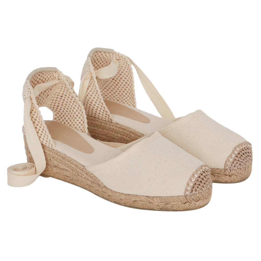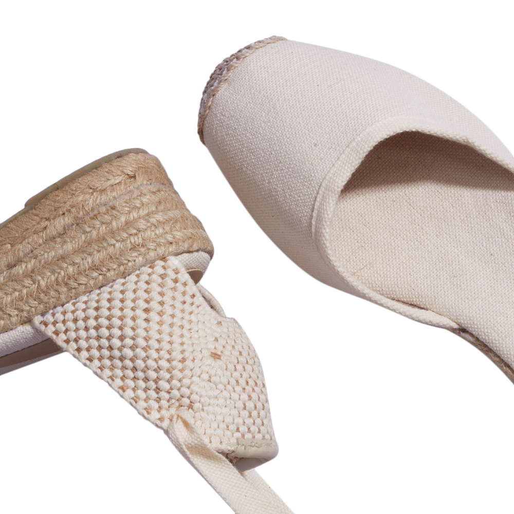 Espadrille Menorca Bege com sola em juta orgânica entrelaçada, salto baixo de 4 cm. Feita em lona 100% algodão. Ponteira em crochê vazada que deixa o ar circular. Palmilha macia e acabamento em pelica para maior conforto.